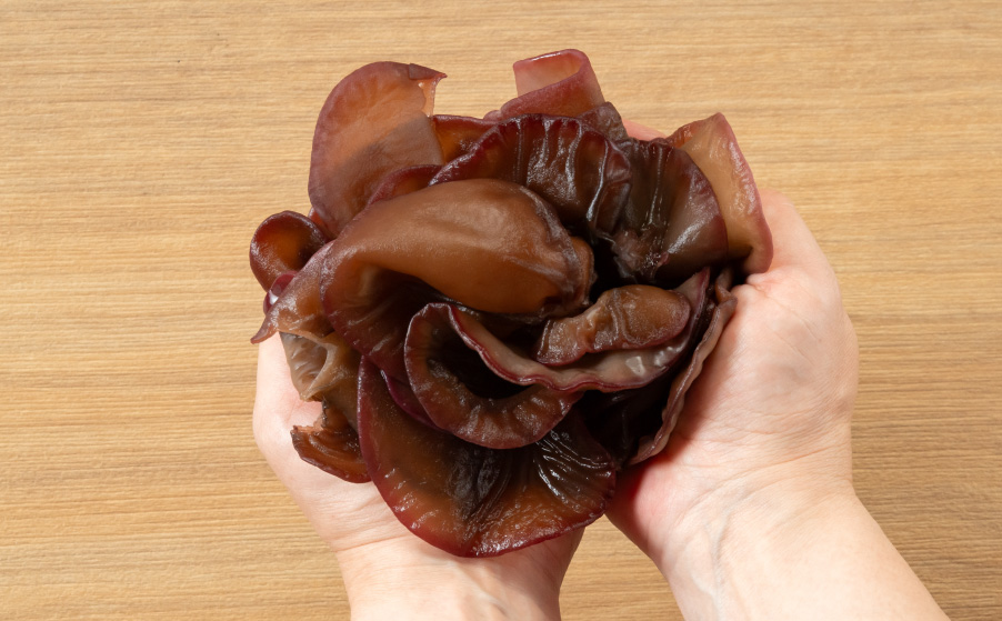 まるで大黒様の耳たぶのように大きく、肉厚な姿に誰もがびっくり。神谷農園の生きくらげはボリューム満点で、瑞々しく、ぷりぷりとした食感が特徴です。ストックしやすい乾燥きくらげもあり、こちらはコリコリとした弾力が楽しめます。